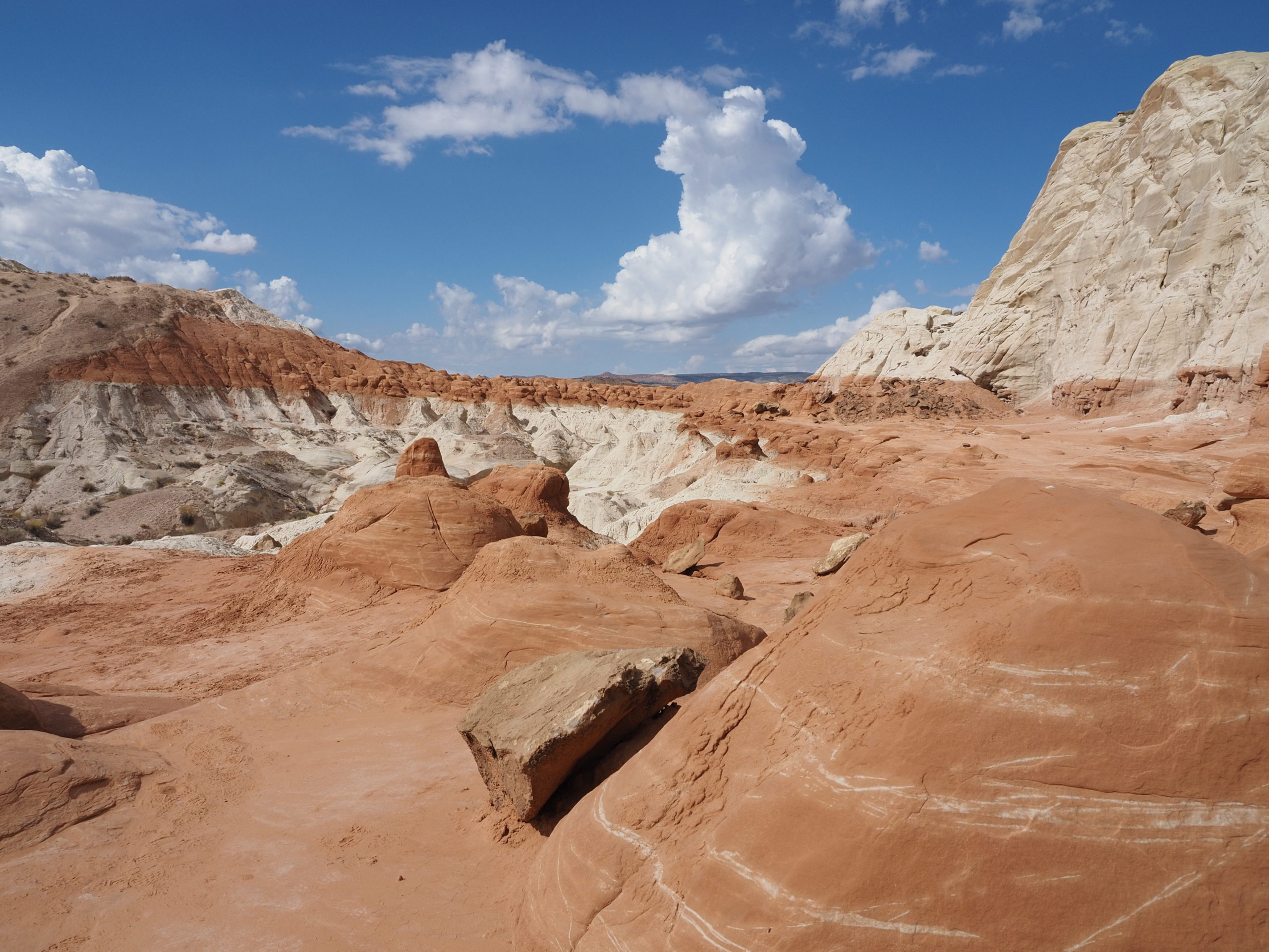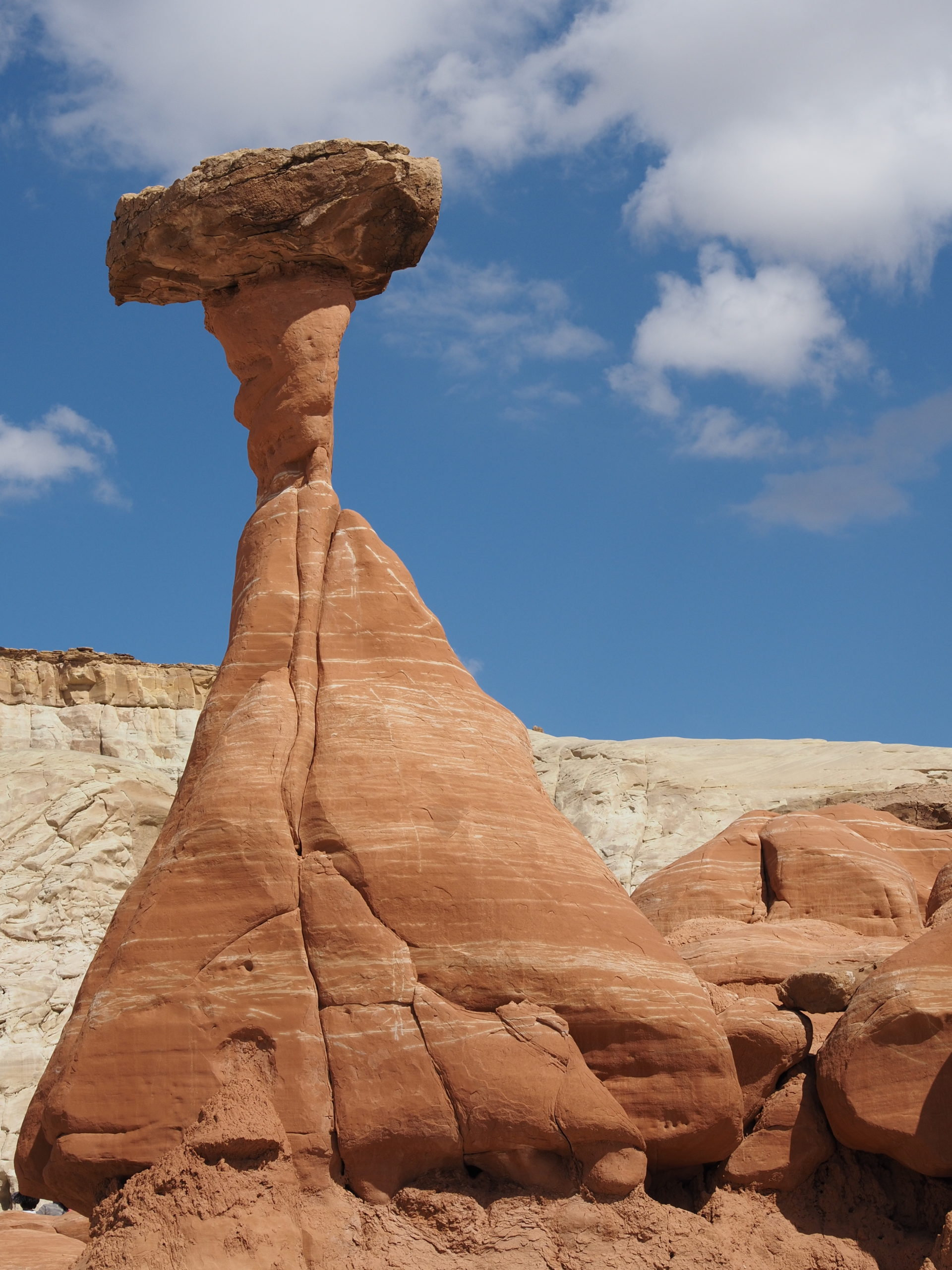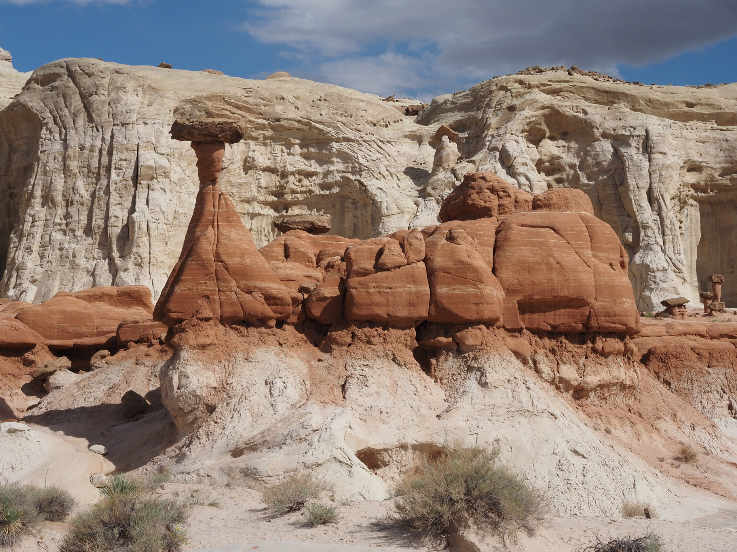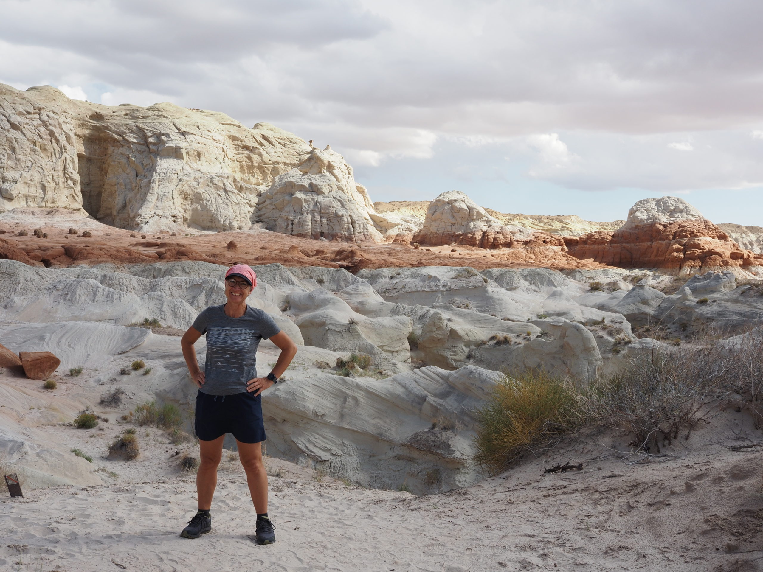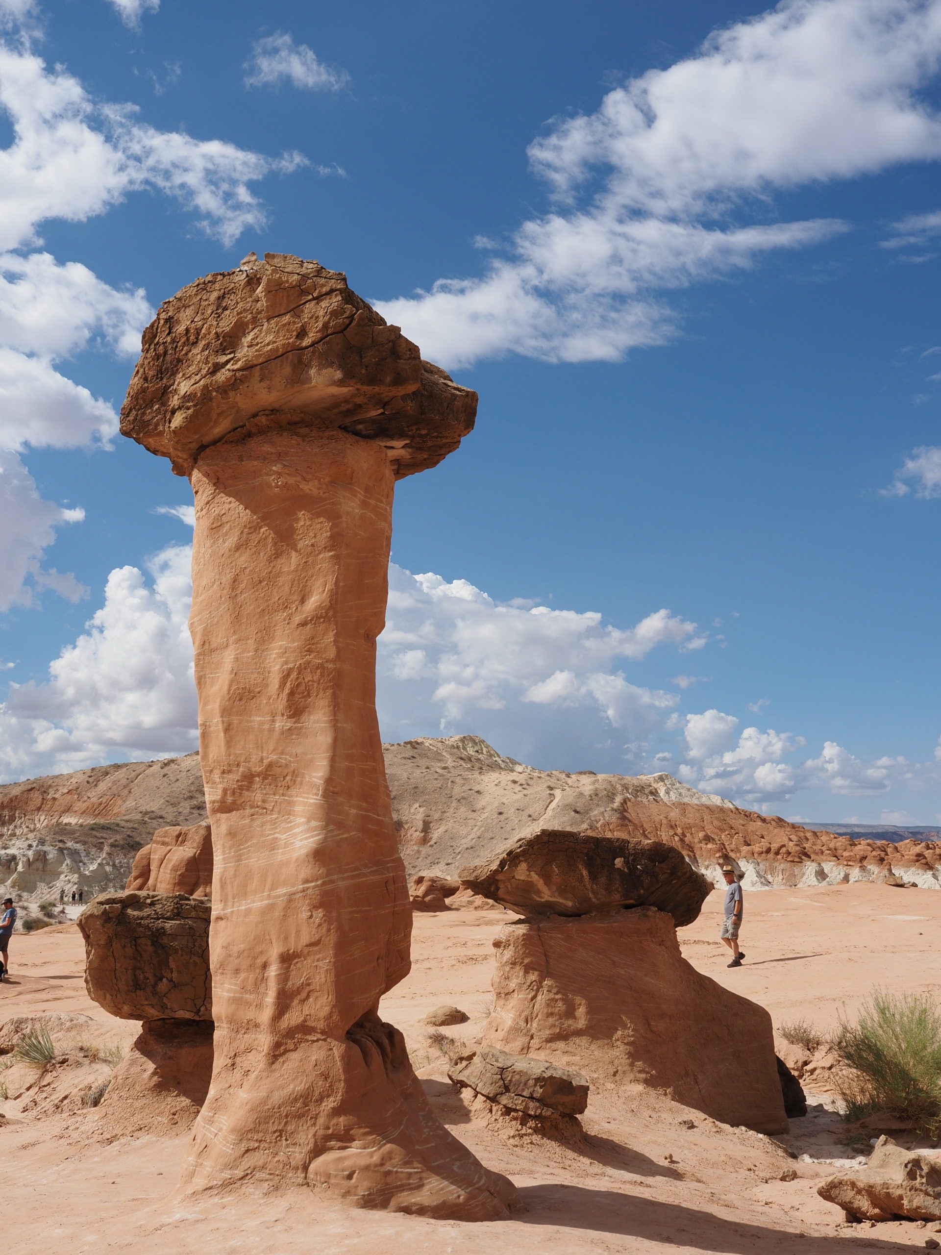 Wir verbringen zwei Tage in der Gegend um Page. Dort befindet sich der große Colorado – Staudamm, der für den Lake Powell verantwortlich ist. Die weite Landschaft drumherum ist Navajo-Indianerland. Eine karge Wüste mit vielen Tafelbergen und rotem Sand. Wir fahren zu einem kleinen Walk, dem Toadstool Hike. Es geht ein trockenes kleines Flussbett hoch zu einem Plateau, wo sich fantastische und farbenprächtige Gesteinsformationen befinden.