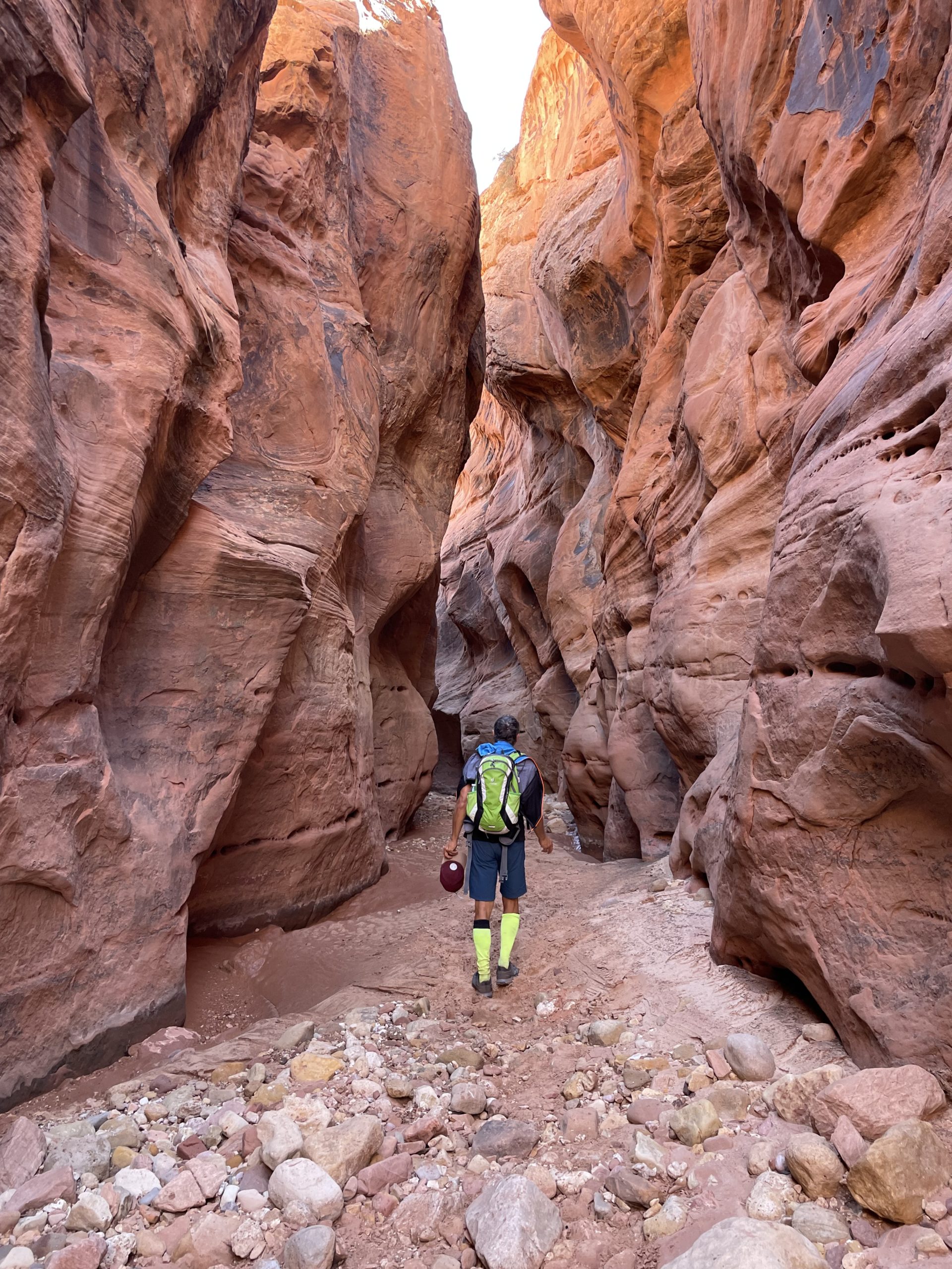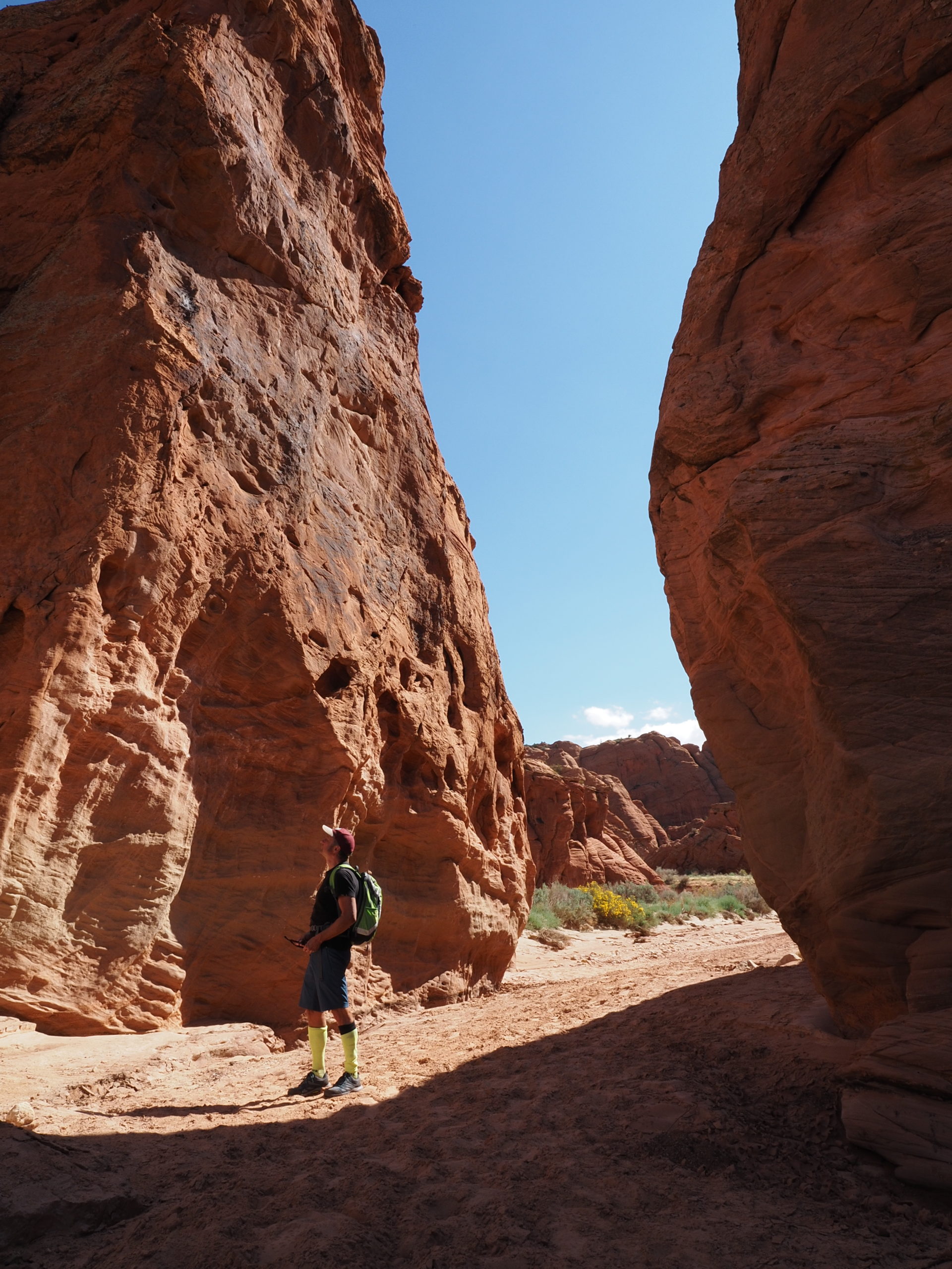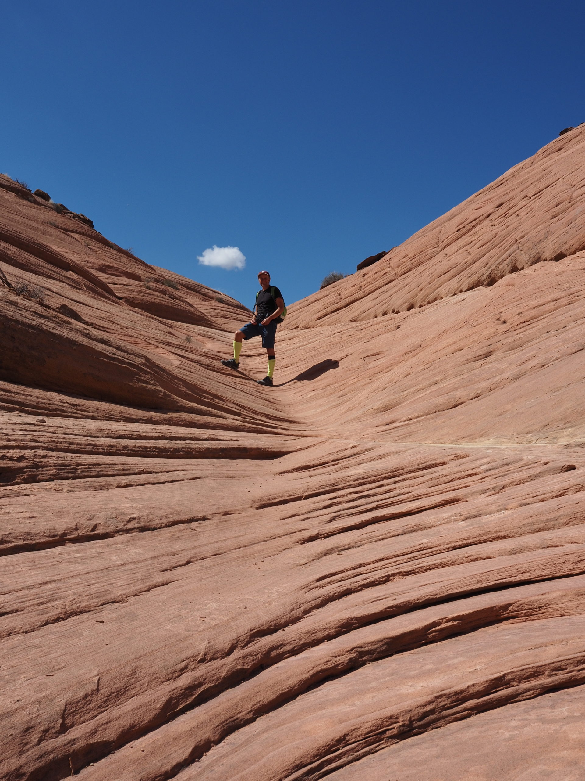 Am zweiten Tag machen wir uns auf zu einem sogenannten Slot Canyon. Für diese engen Schluchten ist diese Gegend hier gekannt und wie es die Übersetzung des Wortes Slot schon andeutet handelt es sich um eine wirklich enge Schlucht. Die meisten dieser Art sind nur mit Führung zu betreten (teuer!), wenn man aber bereit ist einen längeren Fußmarsch auf sich zu nehmen, dann kann man z.B. den Buckskinn Gulch (fast) umsonst haben und muss ihn nur mit ganz wenigen anderen teilen. Tatsächlich haben wir nur eine Familie und drei weitere Personen im Laufe von fünf Stunden getroffen. Dabei sind wir 15 km gewandert.