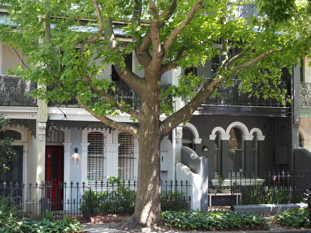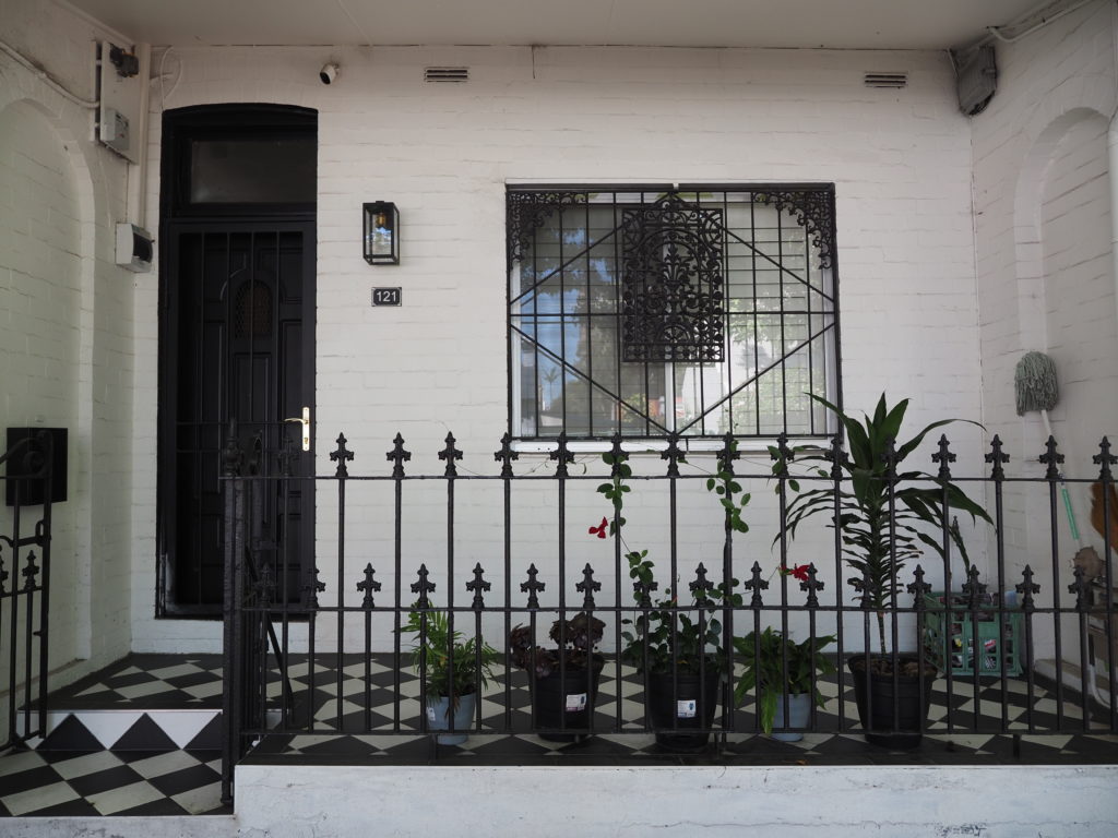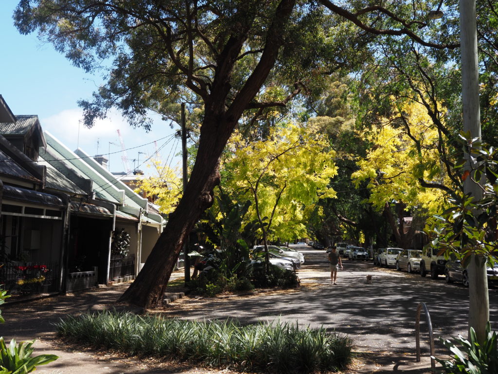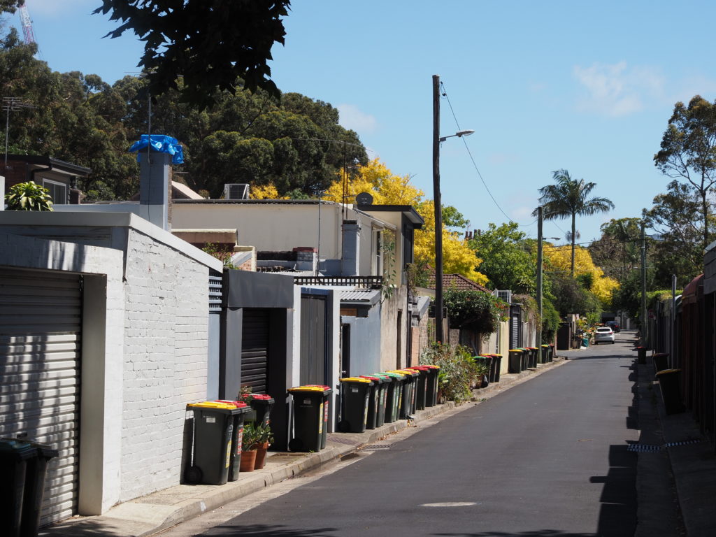 Im hippen Viertel Surry Hills gibt es viele sehr hübsche alte kleine Reihenhäuser, die oft hinter schattigen Bäumen stehen. Die meisten sind mit typisch englischer Schmiedekunst versehen: filigrane florale Musterleisten und Bögen und Geländer. Die Straßen hinter diesen alten Reihenhäusern sind schmal und ruhig und hinter fast jedem Haus stehen drei Mülltonnen: gelb für Recycling, grün für Biomüll und rot für den Restmüll.