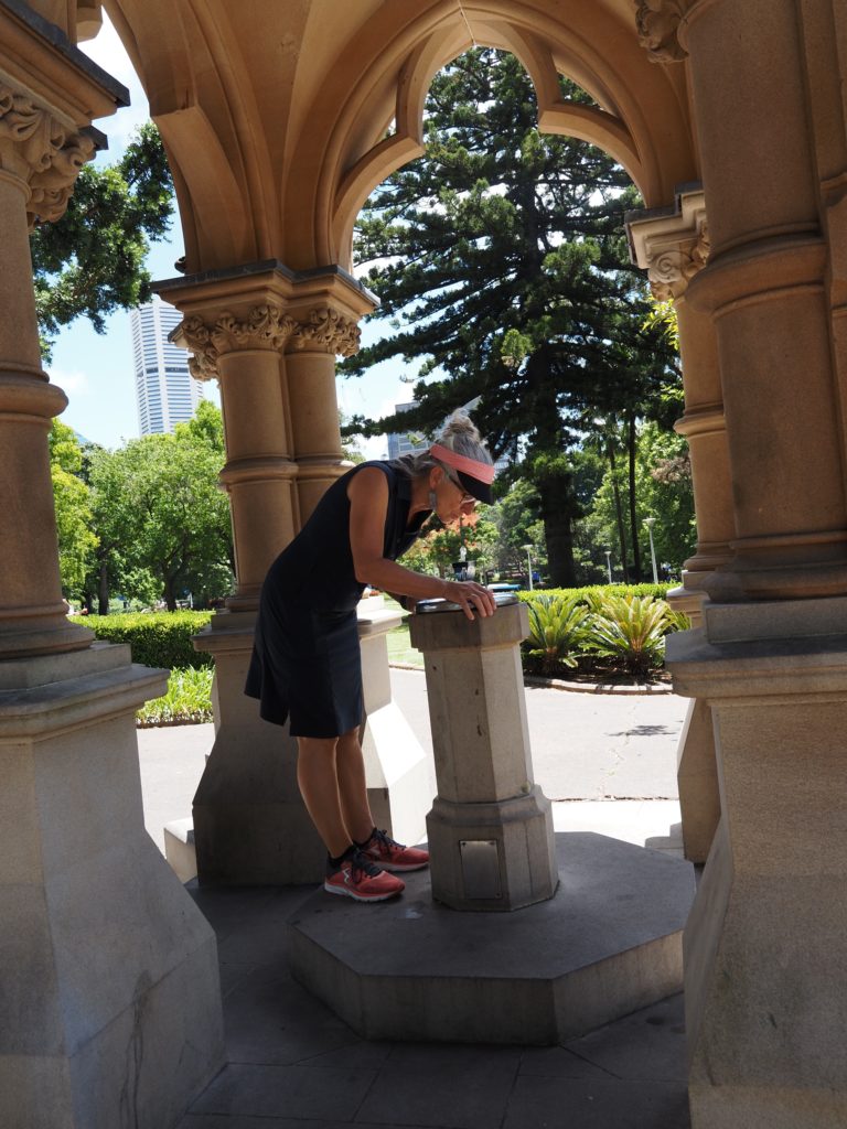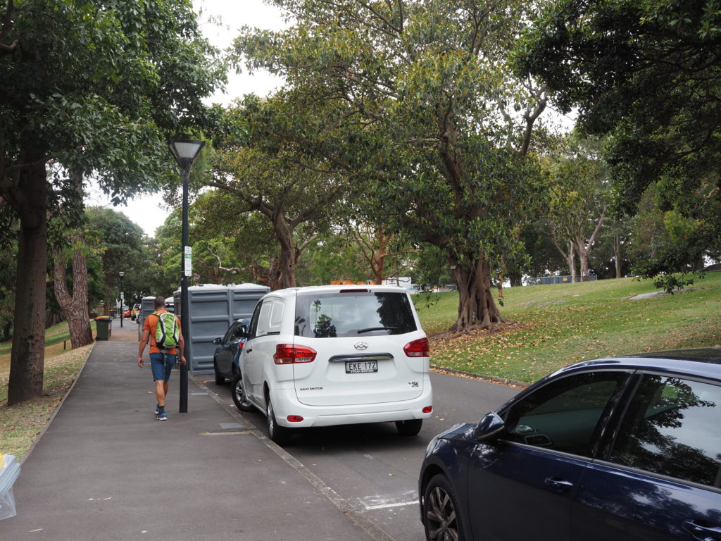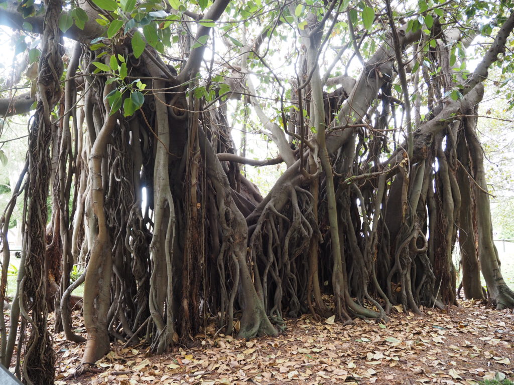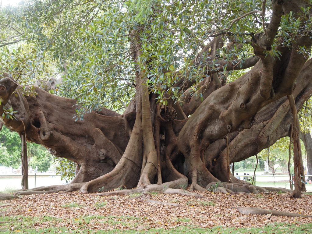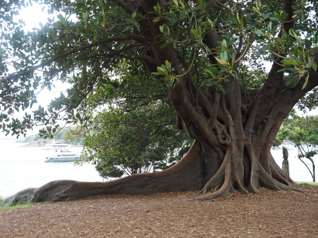 In der Mrs Macquaries Road standen wir vor über 30 Jahren mit unserem VW-Bus TiTschi über Nacht und auch tagsüber. Heute unvorstellbar! Die Stunde kostet 6 Euro Parkgebühr. Die Straße ist gleich hinter dem Botanischen Garten, wo es viele beeindruckende Bäume gibt. V.a. welche mit erstaunlichen Stämmen: bei einem bilden viele kleine luftwurzelähnliche Stämme den Stamm eines Baumes, bei anderen ist der Stamm weit aufgefächert.