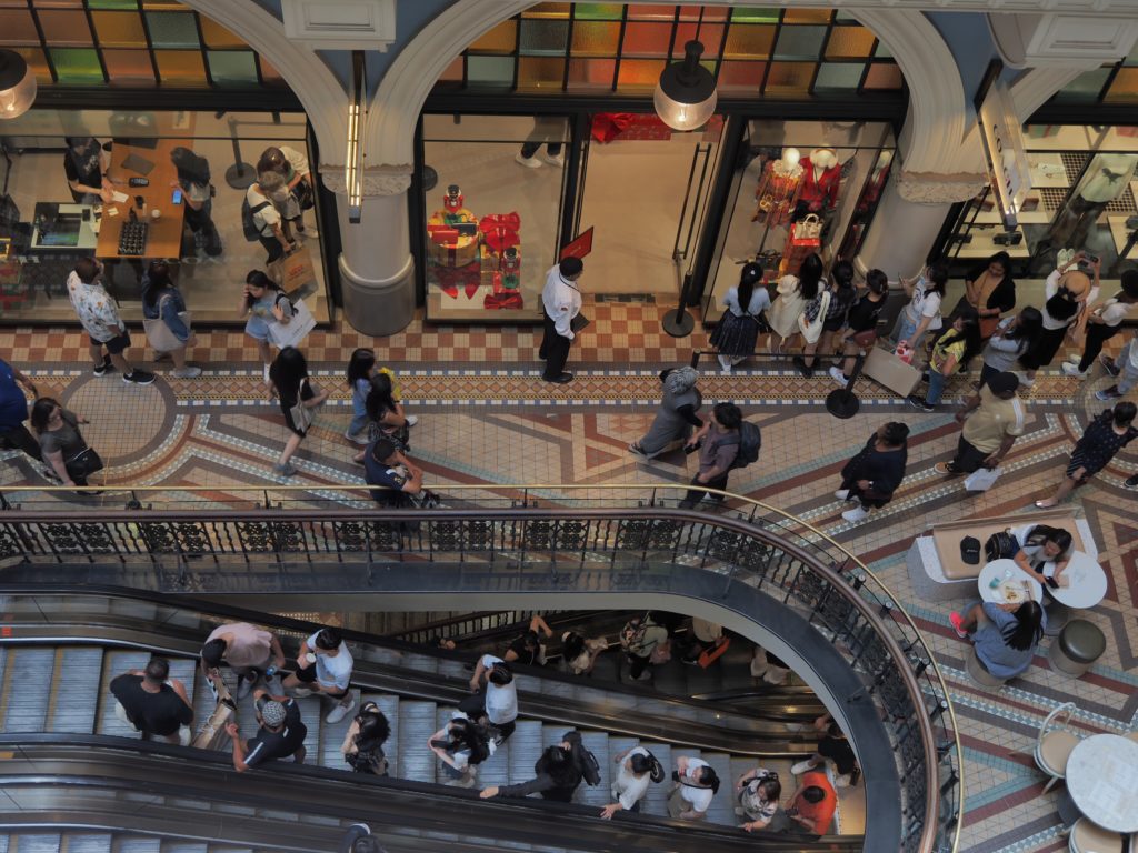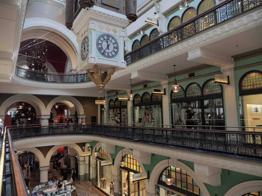 Das Haus der Klukies ist ein gutes Stück von Downtown Sydney entfernt und so haben wir uns für vier Tag eine Ferienwohnung in Sydney gemietet, um die Stadt zu erkunden. Der Zug bringt uns direkt zur Queen Victoria Mall. Diese Mall ist wunderschön! In bunten Farben geschmackvoll gestaltet mit vielen Elementen aus der guten alten englischen Zeit. Es gibt darin neben den üblichen „Verdächtigen“ aber auch exklusive Geschäfte wie z.B. einen Shop für die Rasur. Dort werden bestimmt 50 verschieden Rasierpinsel und anderes Zubehör verkauft. Und die Toilette für die Damen heißt Powder Room und hat tatsächlich einen Schminktisch in der Mitte stehen und ein rotes Sofa zum Ausruhen von der anstrengenden Shoppingtour ist auch vorhanden. Da heute Boxingday ist und an dem Tag traditionell es in den Geschäften satte Rabatte gibt ist ordentlich was los!