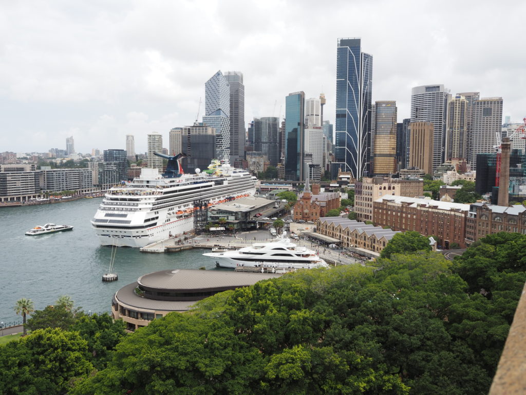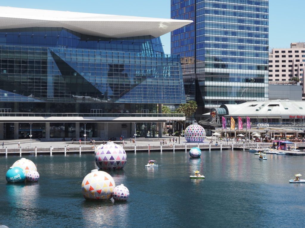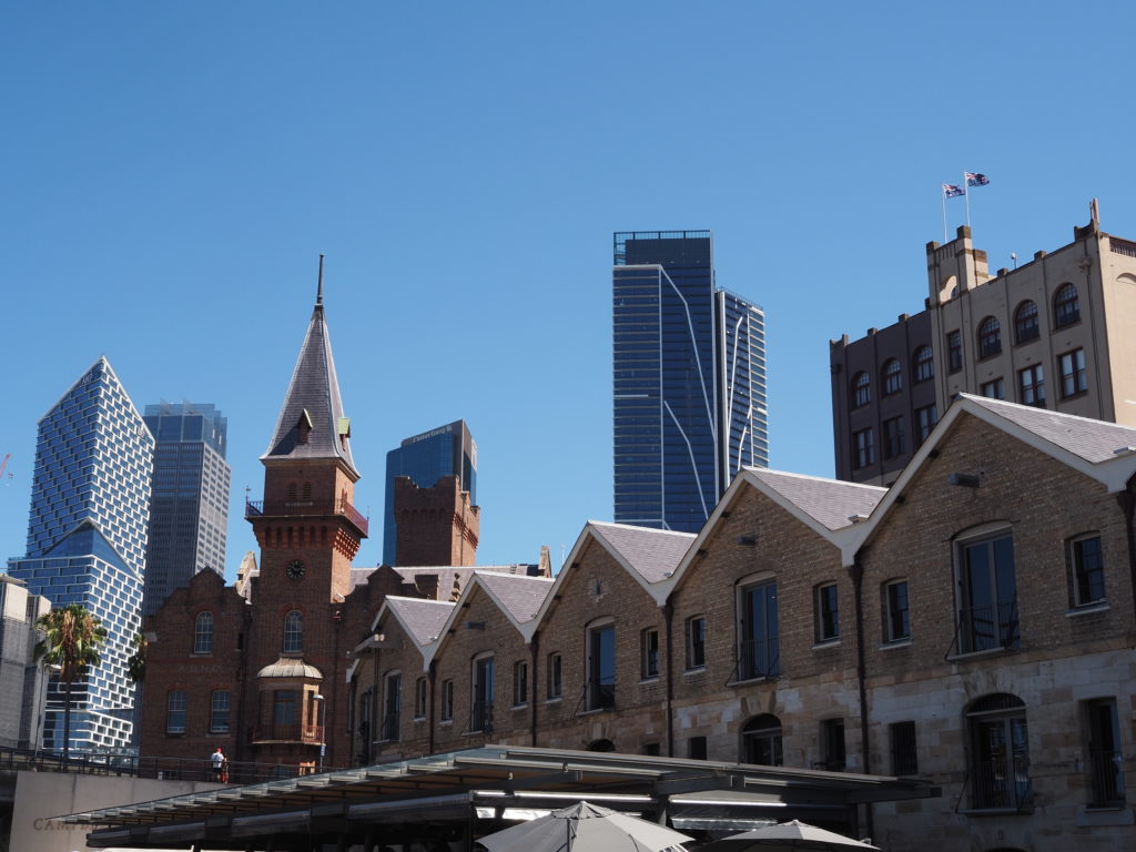 Sydney ist ein Stadt mit viel Wasser! Darling Harbour wurde zu den Olympischen Spielen 2000 ganz neugestaltet. Jetzt zur Weihnachtszeit schwimmen auf dem Wasser riesige Weihnachtskugeln. Und Circular Quai ist der alte Hafen der Stadt mit einem sehr tiefen Becken, so dass selbst Kreuzfahrtschiff-Riesen dort vor Anker gehen können. Hinter den alten Gebäuden des Hafens schließen sich direkt moderne Hochhäuser an.