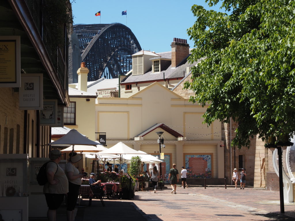 The Rocks, das ist der älteste Stadtteil von Sydney. Wunderschöne alte Reihenhäuser und Lagerhäuser. Die Straßen dort sind teilweise ruhig. Aber natürlich gibt es viele Lokalitäten – Urlaubsfeeling.