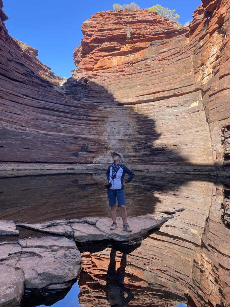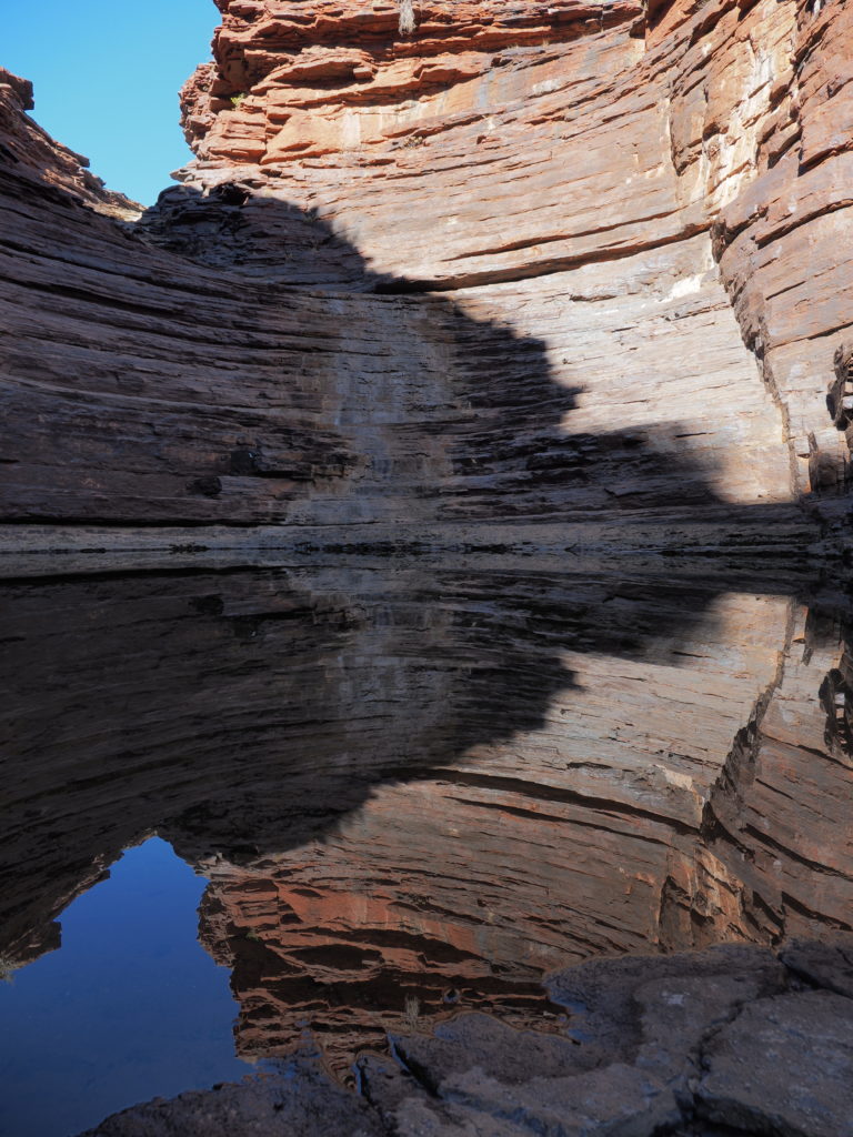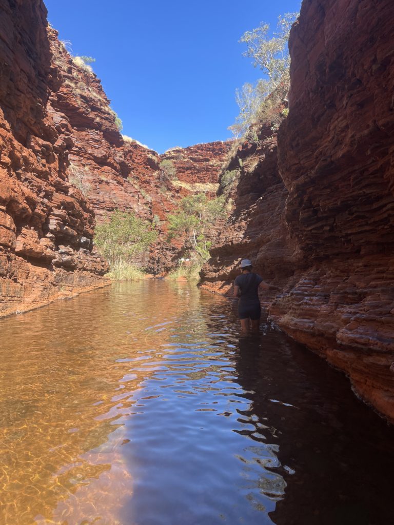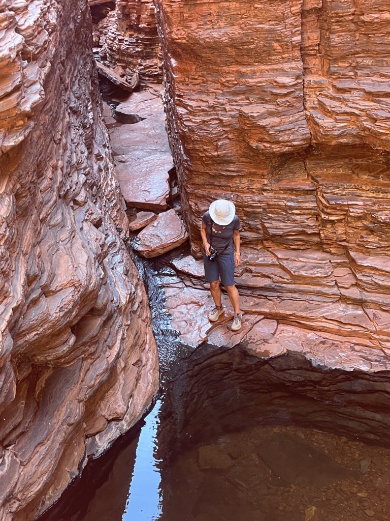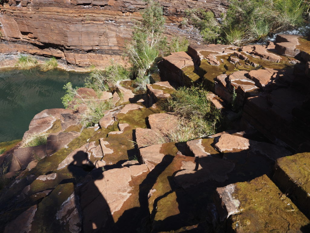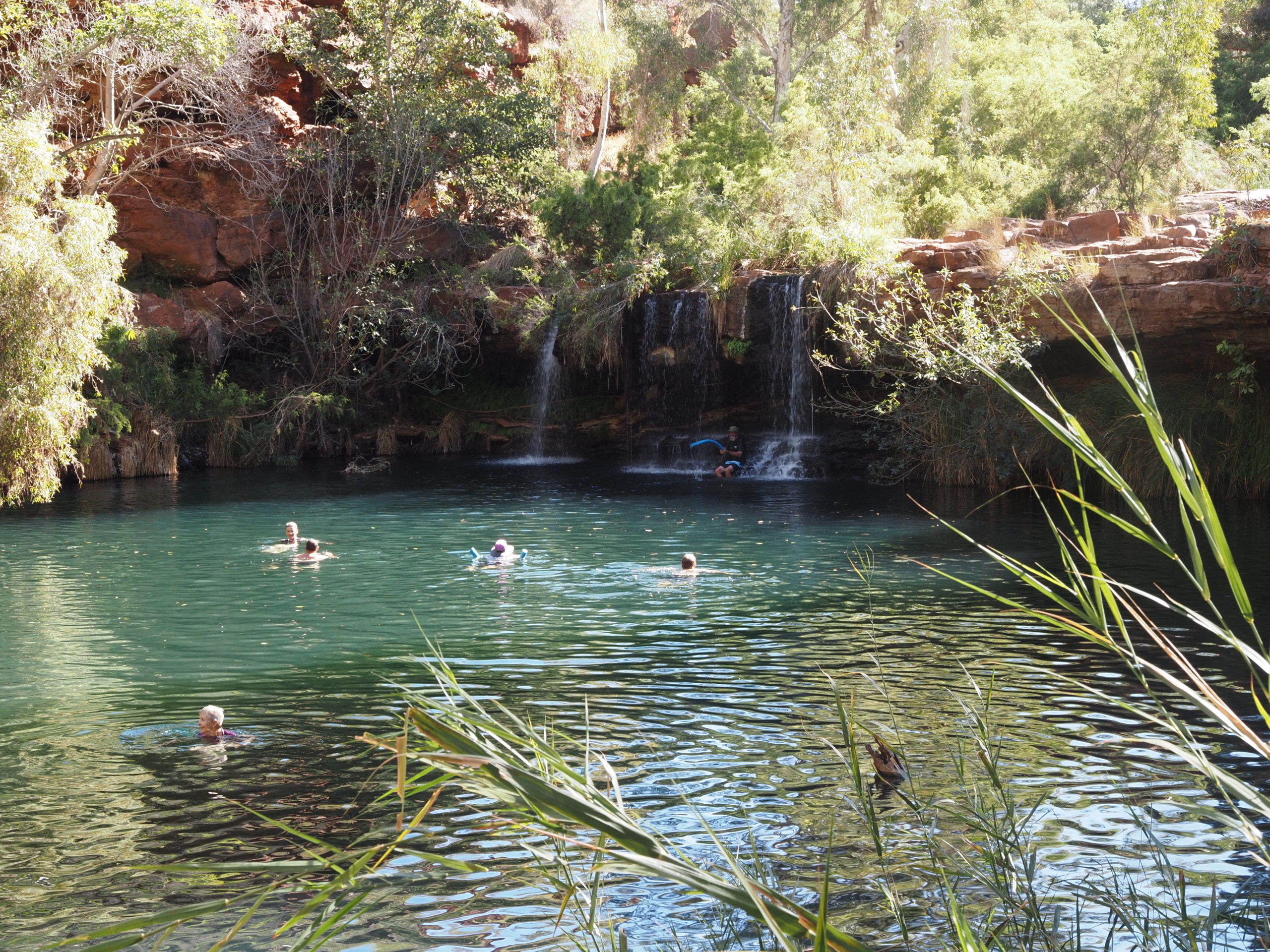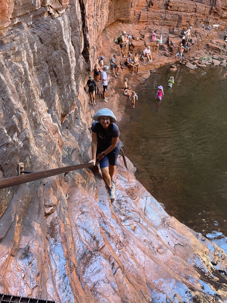 Wer nicht ganz so fit ist, kann die Wanderung durch die Schlucht auch weglassen und nur über Leitern zum Pool hinabsteigen. Lustig ist, dass es eine Warnung vor extrem kaltem Wasser gibt, v.a. in den Monaten Juli – September: das Wasser hatte 20 Grad! Die Australier beim Reingleiten in diesen kalten Pool zu beobachten, ist schon witzig. Übrigens lieben die Aussis Pool-Nudeln wann immer sie ins Wasser gehen. So hatten viele an ihrem Rucksack welche befestigt, was wirklich lustig ausschaut!