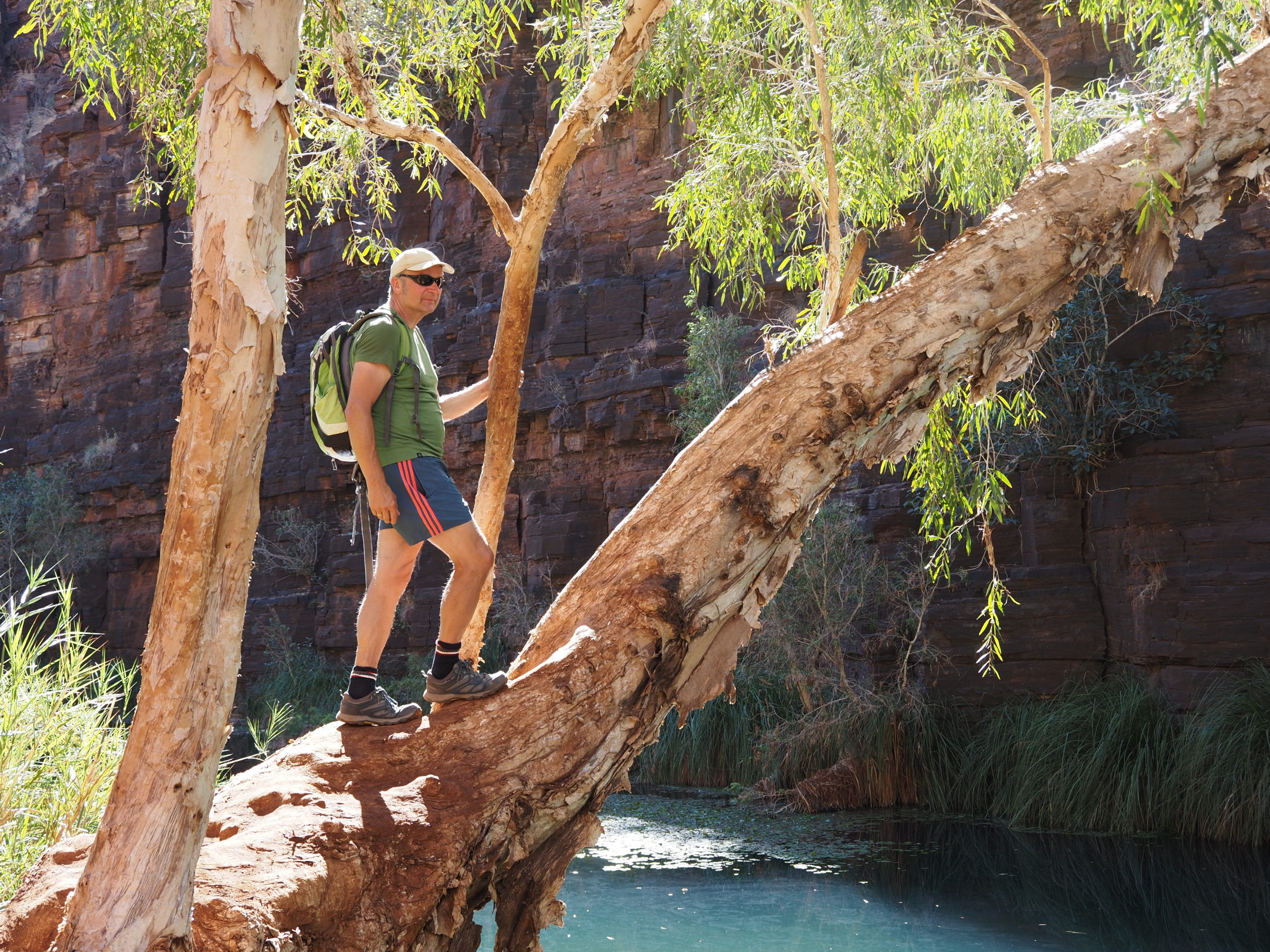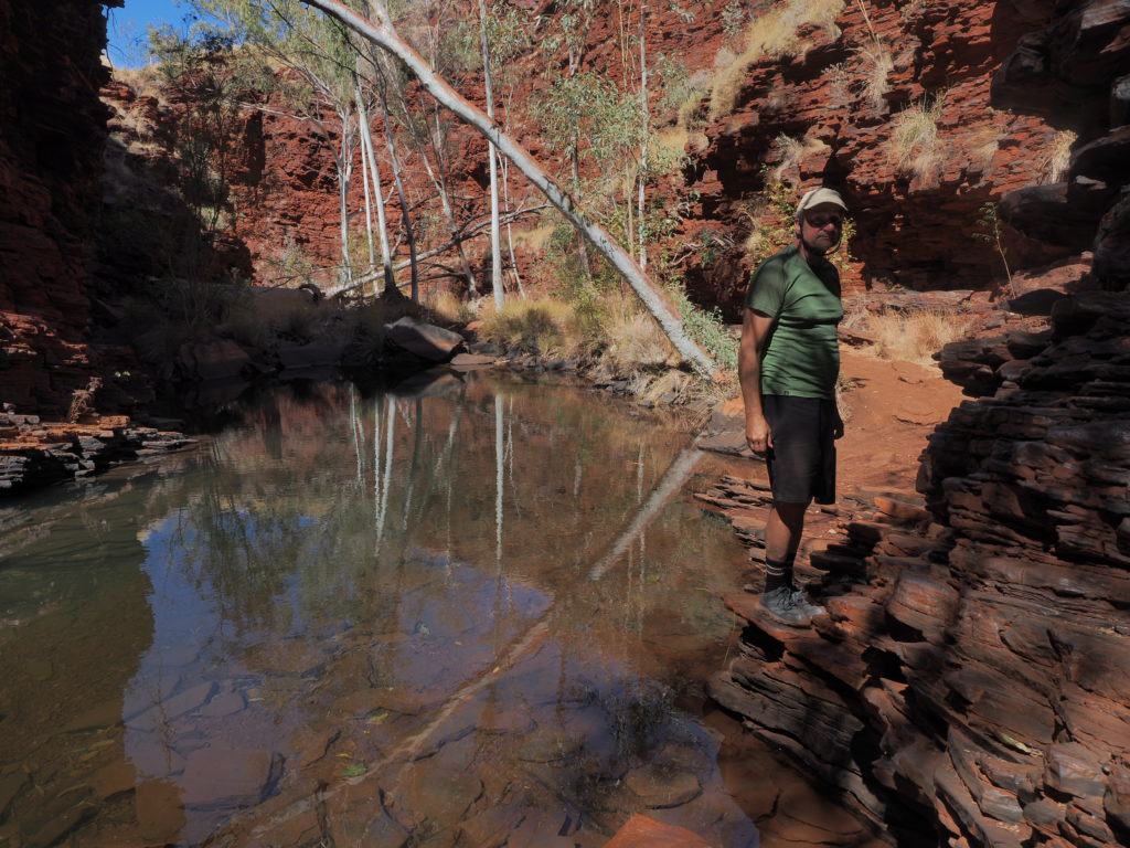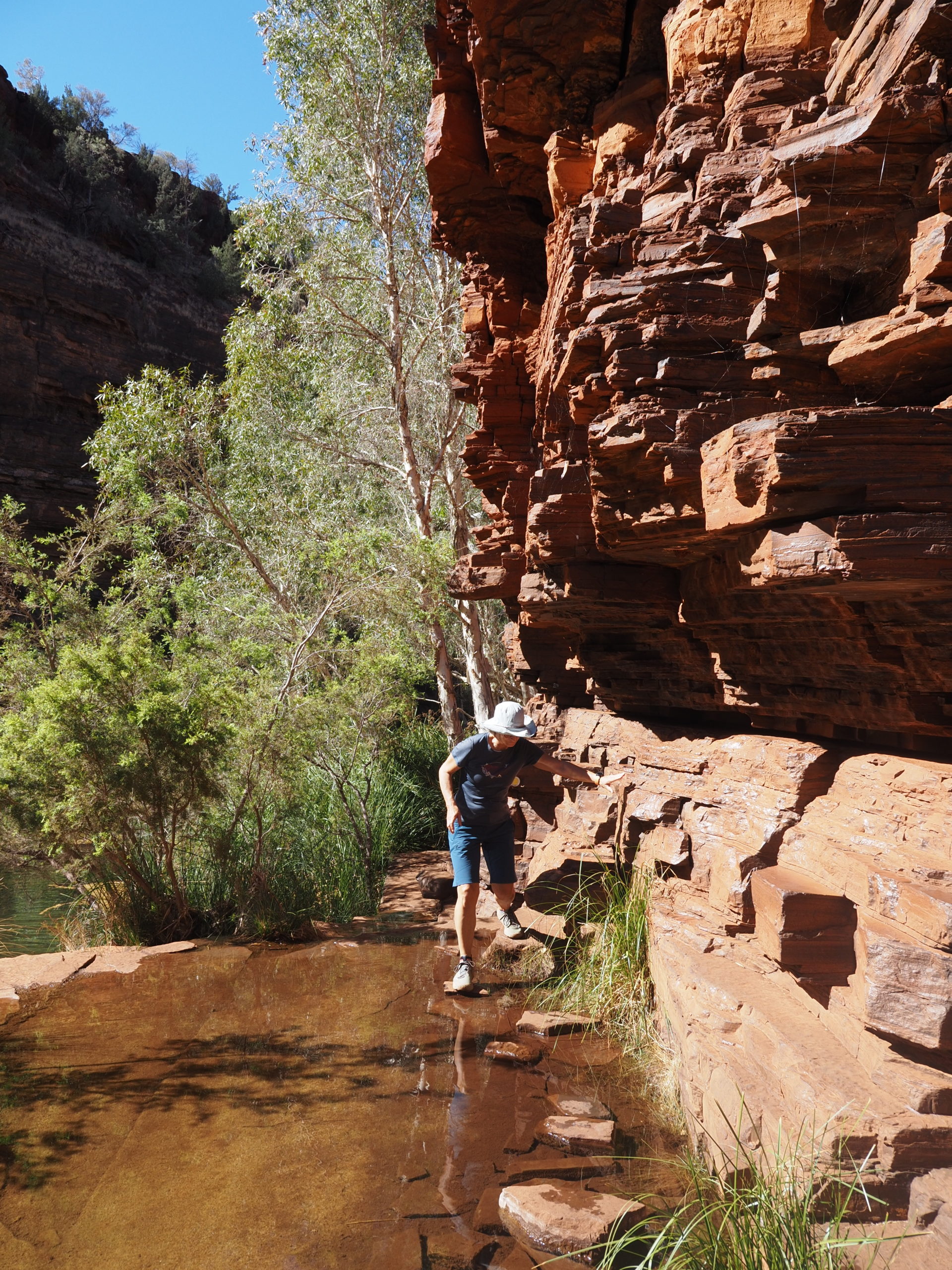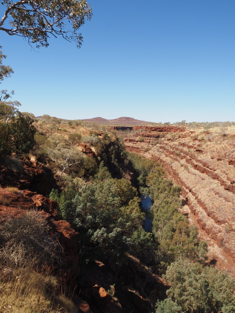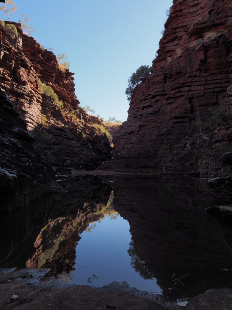 Unsere erste Wanderung ging in die Dales Gorge. Man geht erst am oberen Rand der Schlucht entlang und kommt dann nach einem kurzen Abstieg in eine wildromantische Schlucht an deren Ende ein tiefer natürlicher Pool die ersehnte Erfrischung bringt.