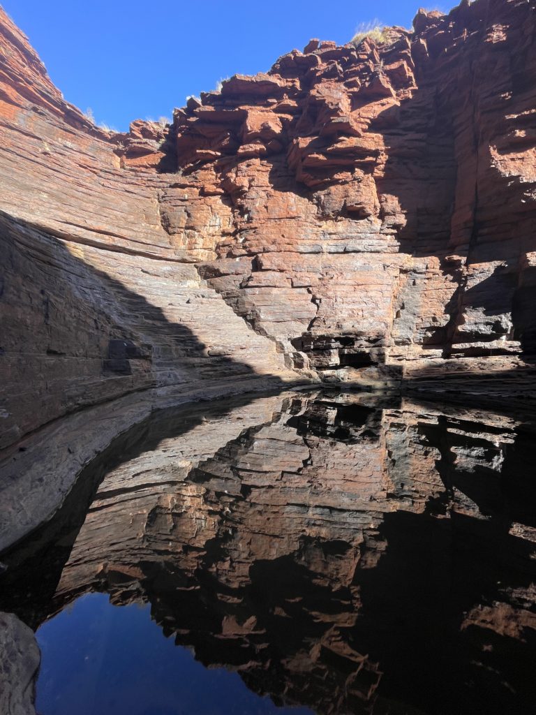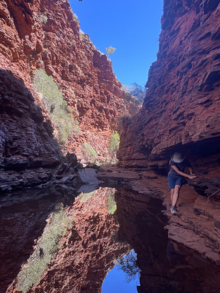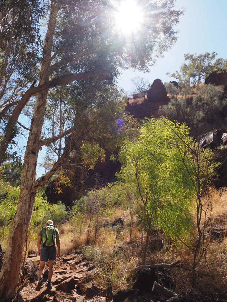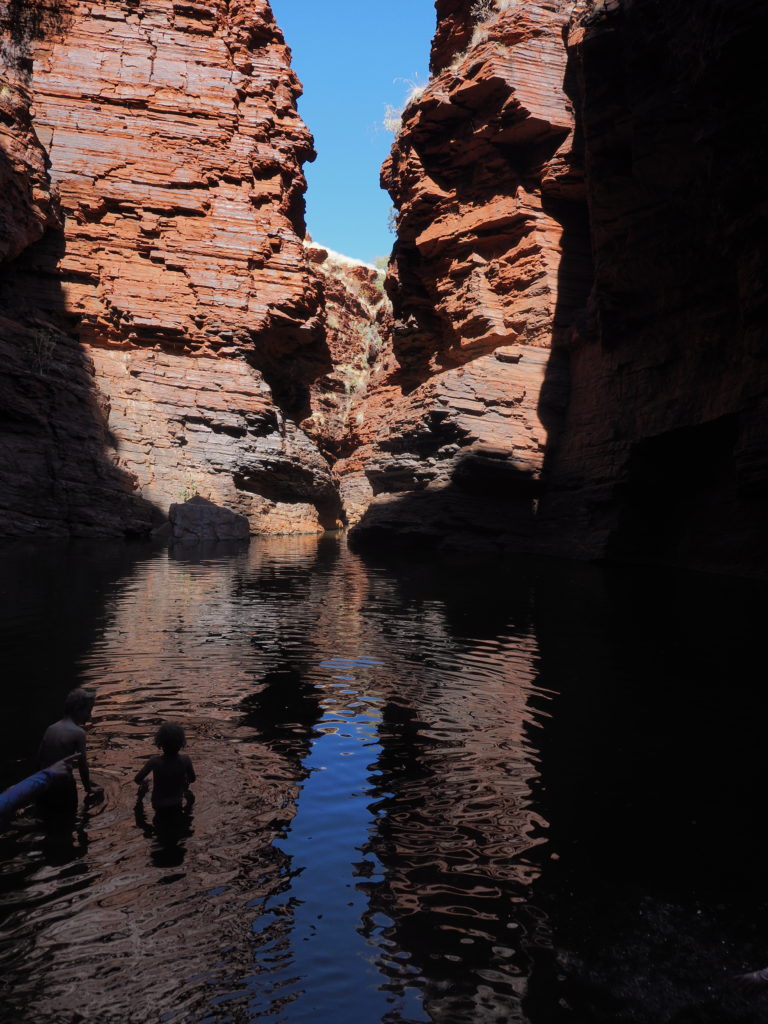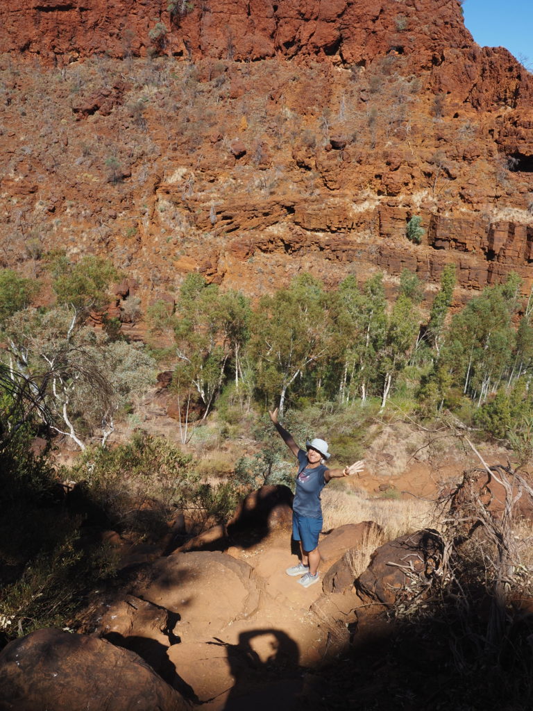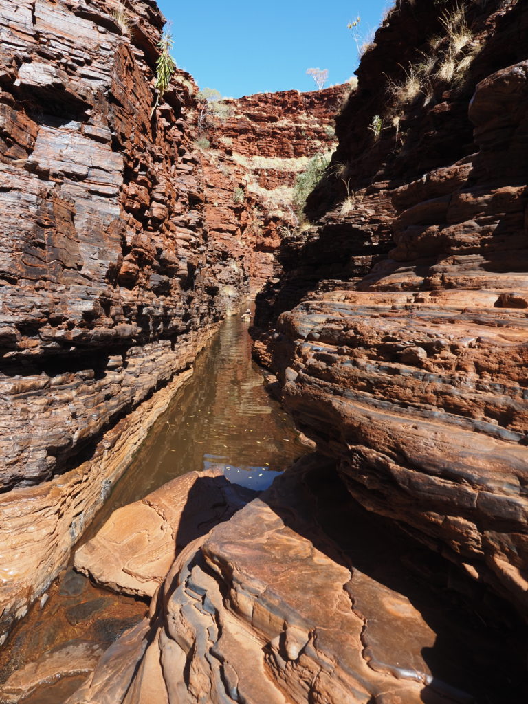 Unsere erste Wanderung ging in die Dales Gorge. Man geht erst am oberen Rand der Schlucht entlang und kommt dann nach einem kurzen Abstieg in eine wildromantische Schlucht an deren Ende ein tiefer natürlicher Pool die ersehnte Erfrischung bringt.