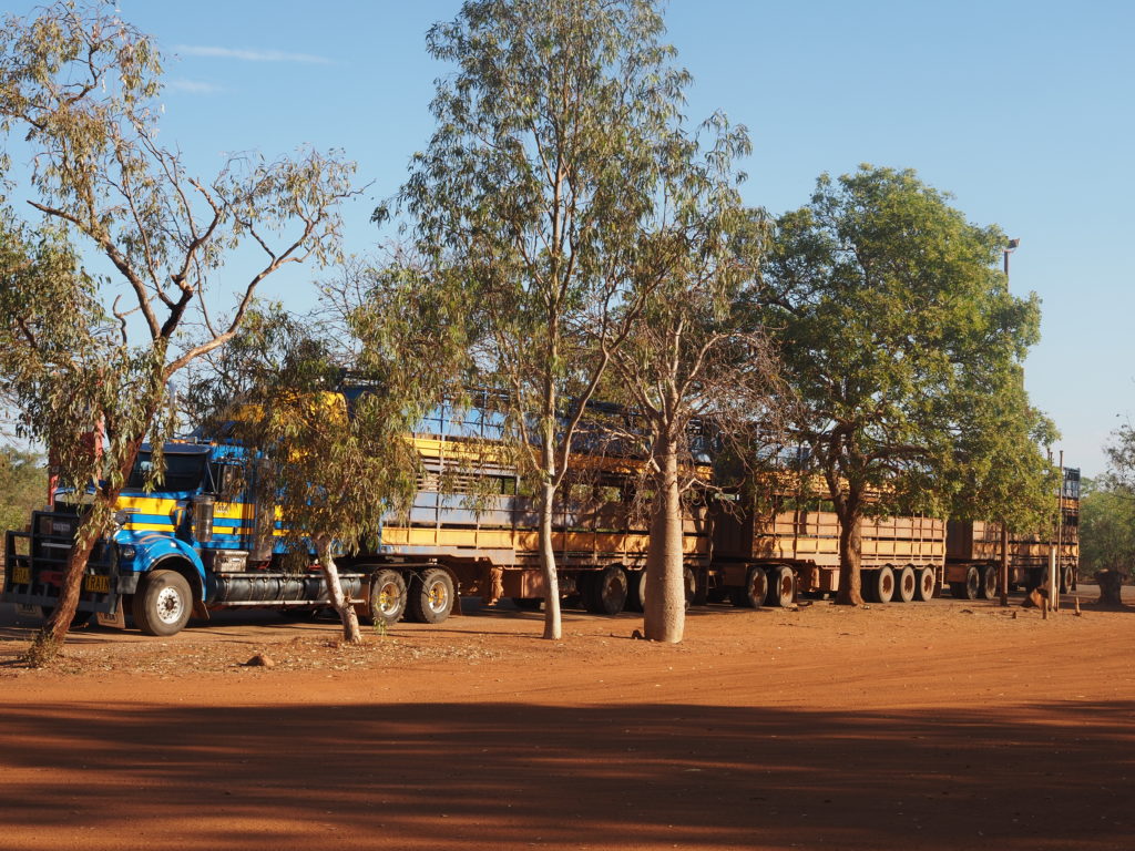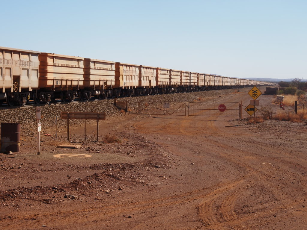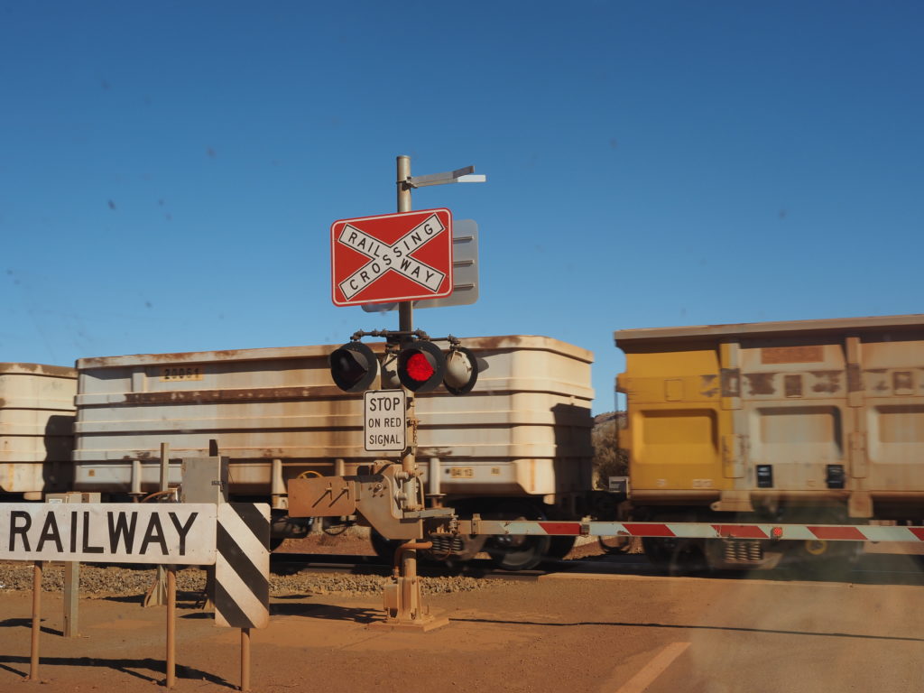 Als wir den Nationalpark am Nachmittag wieder verlassen, werden wir an einem Bahnübergang von einem jener ultra langen Verladungszüge aus den Erzminen, die in der Gegend um den Karijini sind, aufgehalten. Es dauert über 2 Minuten bis der Zug in seiner ganzen Länge an uns vorbeifahren ist. Viel Zugverkehr gibt es außer in den Großstädten ja nicht in Australien.