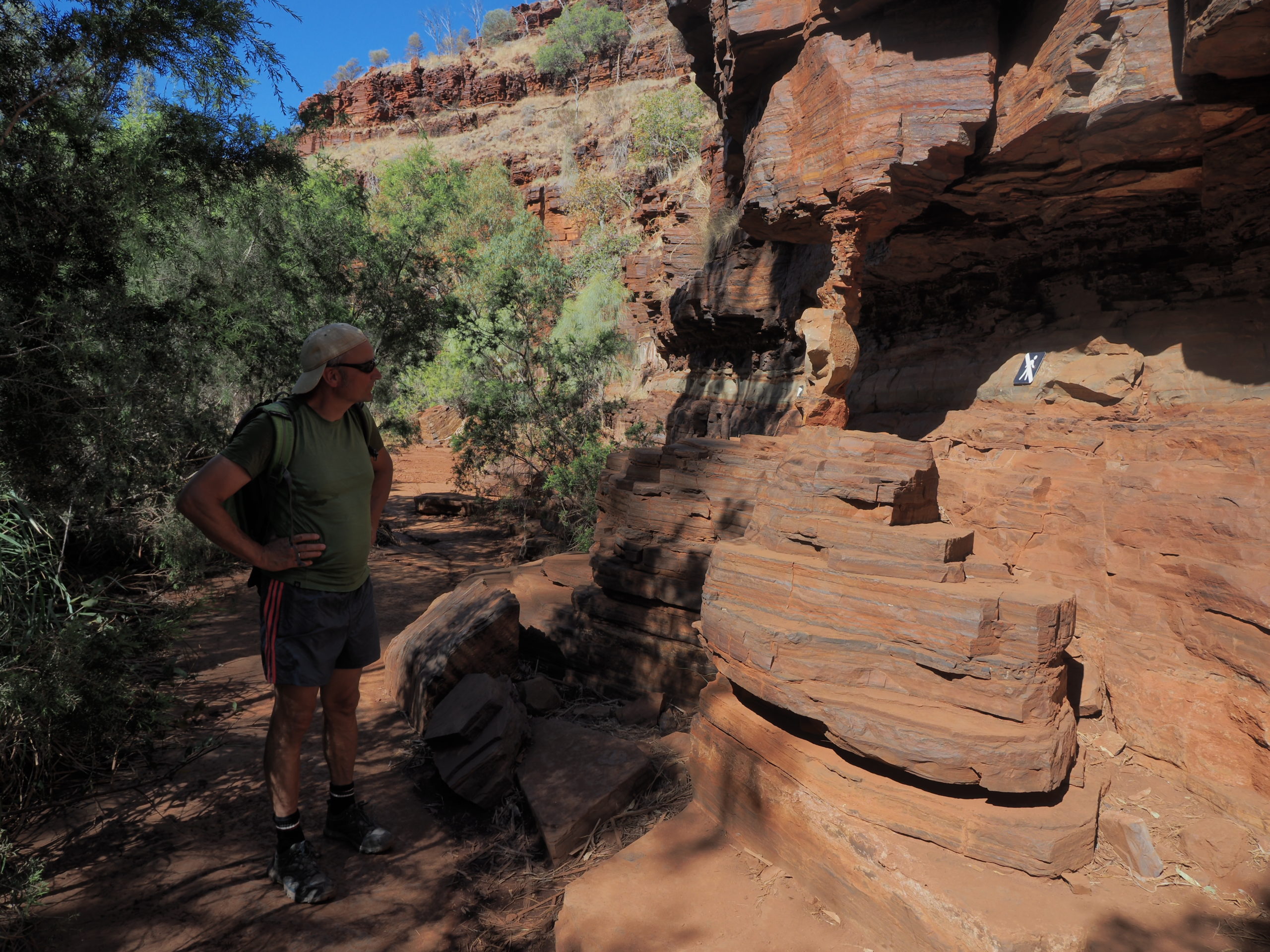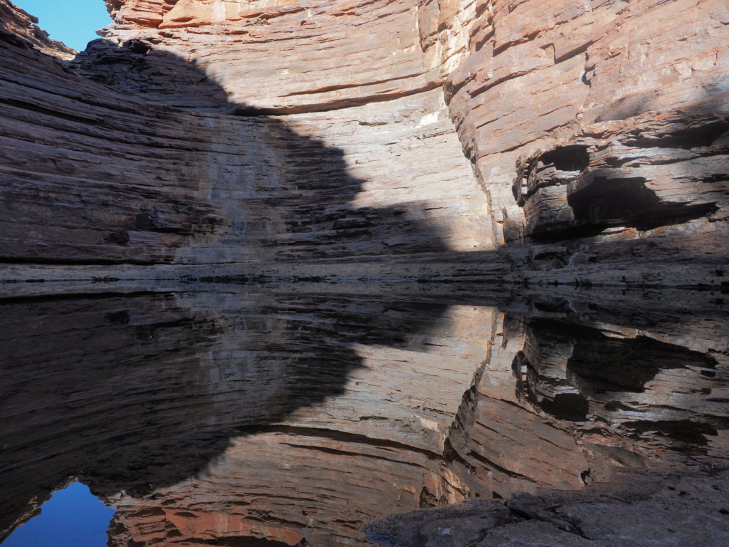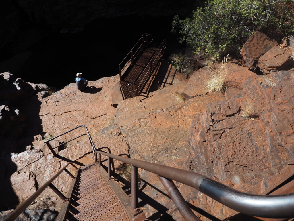 Am nächsten Morgen sind wir nach dem Sonnenaufgang zu den Joffre Falls. Wasserfall gab es jetzt in der Trockenzeit keinen, aber die Spiegelungen in dem noch vorhandenem Wasser sind wundervoll. Die Wanderungen haben meist einen Umfang von 1-4 km und mit den Leitern (re.Bild) sind die Ab- und Aufstiege gut zu bewältigen.