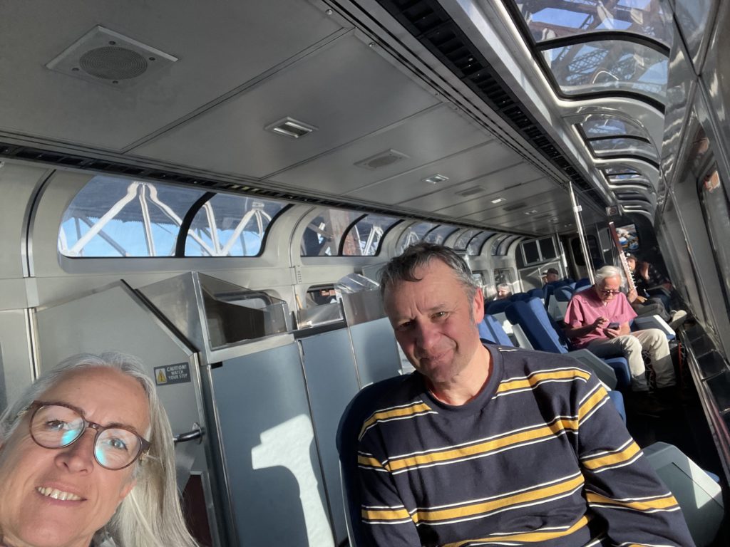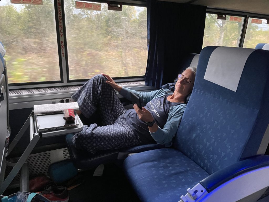 Mit dem Zug haben wir viele Strecken in USA zurückgelegt und sind große Fans der AMTRAK-Züge geworden. Alles so herrlich nostalgisch dort und langsam ist man auf alle Fälle unterwegs. Die Sitze sind sehr bequem, es gibt immer ein Café/Restaurant an Bord. Bei einem Getränk (Essen kann ich jetzt nicht unbedingt empfehlen) ergibt sich oft ein nettes Gespräch mit Mitreisenden und häufig haben die Restaurantwaggons große Panoramafenster. Den Schlafwagen haben wir nicht genutzt, weil der Platz dort gerne 10-mal so teuer ist, als auf dem Sitz.